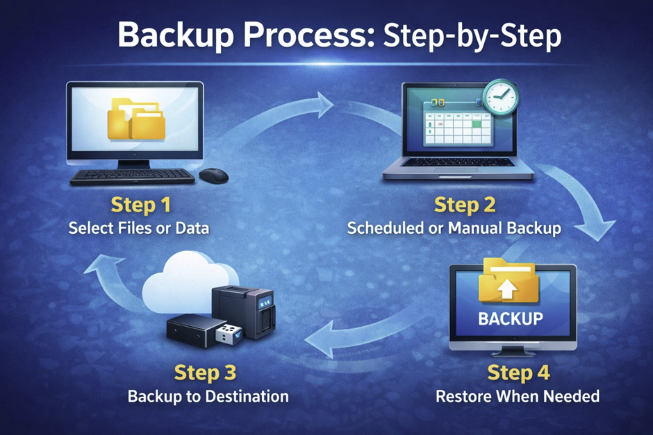 Backup systems typically work by scanning selected files or entire systems, copying them, and storing them in another location. These can include physical devices like USB drives or remote servers managed by companies like Google or Microsoft.