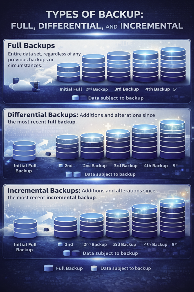 There are several types of backups, including full, incremental, and differential backups. Full backups copy all data, while incremental backups only store changes since the last backup. Differential backups capture changes since the last full backup.