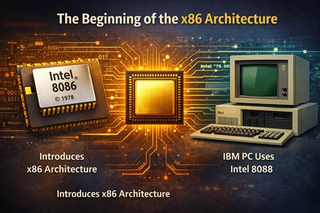 In 1978 Intel introduced the 8086 processor, which established the foundation of the x86 architecture. This processor used a 16-bit design that allowed computers to perform more complex instructions and memory operations.