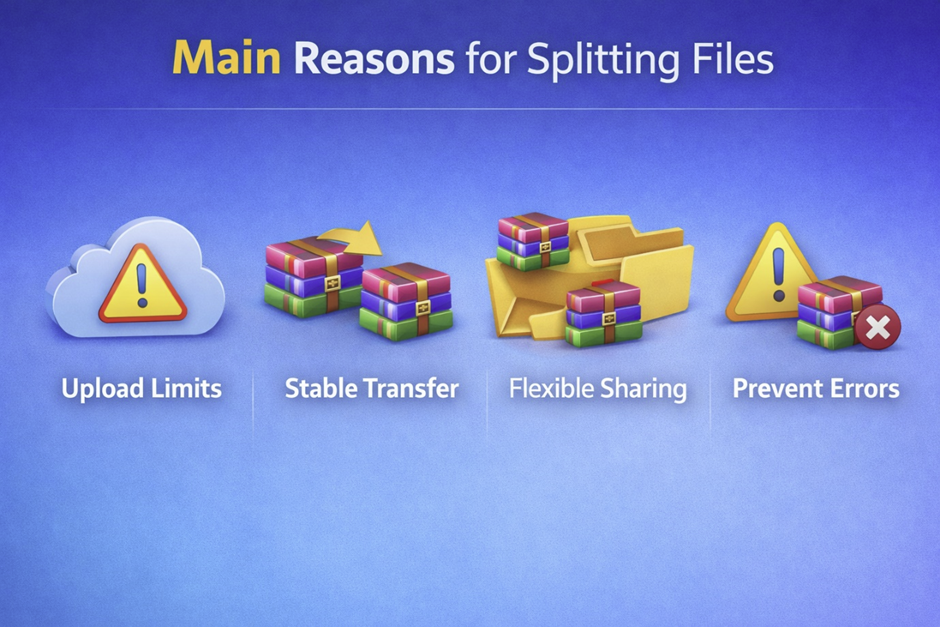 Sometimes we need to upload files to file-sharing services such as Dropbox, Google Drive, or OneDrive, and these platforms often have file size upload limits. In such cases, splitting large files into smaller parts allows you to upload them without exceeding these restrictions. It also makes the upload process more stable, reducing the risk of failure during transfer. Additionally, smaller file parts can be uploaded or shared separately, giving more flexibility when distributing large data.