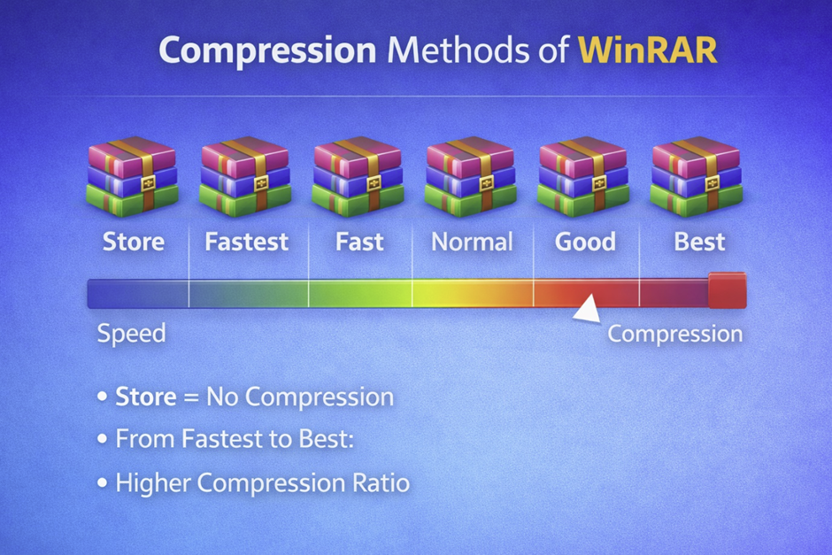 WinRAR provides several compression methods that allow you to balance speed and compression efficiency depending on your needs. You can choose between: Store, Fastest, Fast, Normal, Good, and Best.