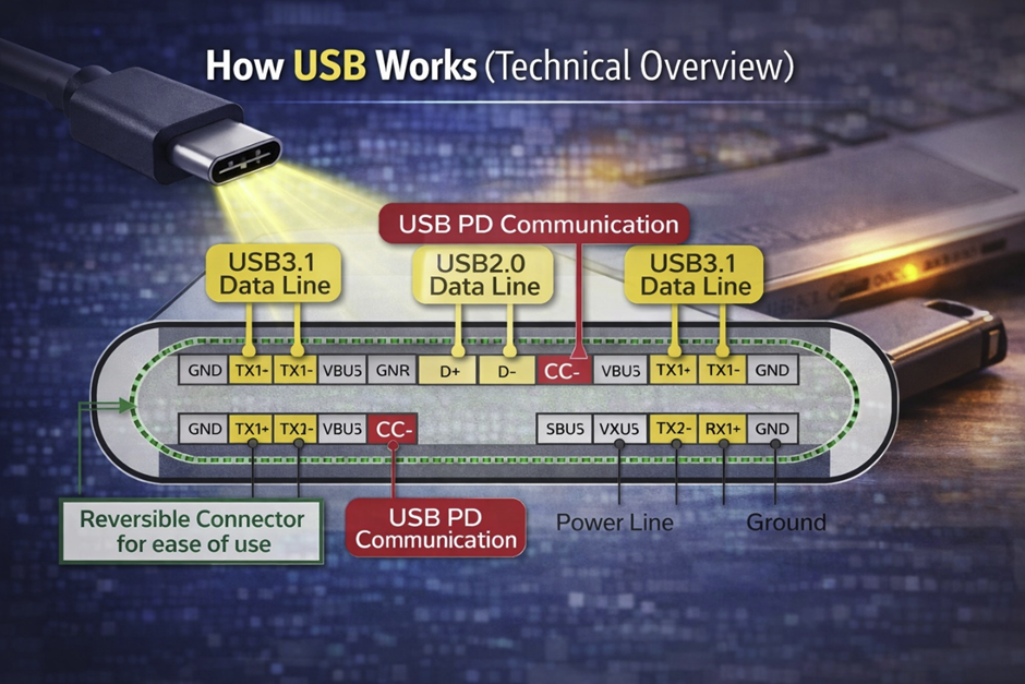 USB operates through a structured communication system between a host and connected devices. The host, typically a computer powered by a CPU, controls the communication and manages data flow. USB uses a tiered star topology, allowing multiple devices to connect through hubs. Data is transmitted in packets, ensuring efficient and reliable communication. USB also supports power delivery, enabling devices to function without separate power sources. This dual capability makes USB highly efficient and widely used. Modern systems running Windows, Linux, or MacOS rely heavily on USB for peripheral connectivity. Its architecture is designed to be scalable and adaptable to new technologies.